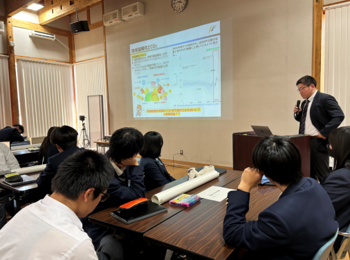 「カーボンリサイクル実証研究拠点」が整備されている大崎上島町に立地する広島県立大崎海星高等学校において、一般財団法人カーボンフロンティア機構と共同で特別授業を実施しました。本授業では、1・2年生約70名を対象に、カーボン・サーキュラー・エコノミーについて学びました。