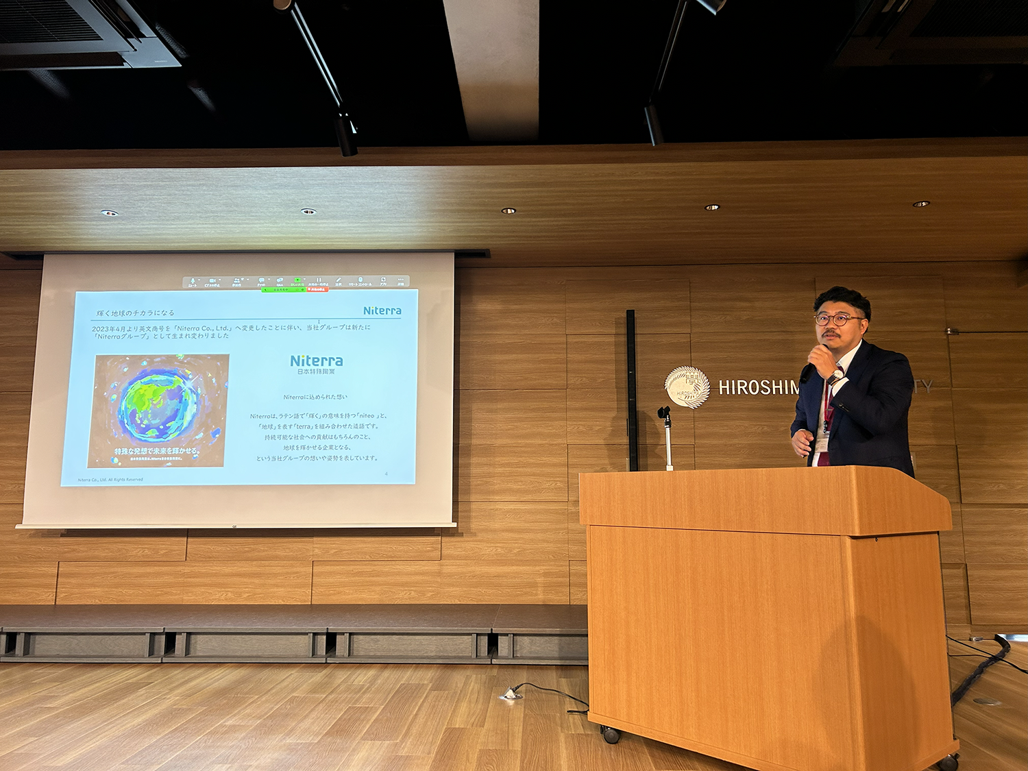 日本特殊陶業㈱は、セラミック技術を基盤に自動車部品や半導体製造装置部品を製造していますが、カーボンニュートラルに向けても固体酸化物セルを用いる燃料電池や水電解装置、メタネーション装置、そしてCO₂回収装置を開発しています。 今回のご発表では、地域でCO₂を地産地消する社会を目指した『地域CCU』のビジネスモデル(国内でのCO₂供給不足を背景に、ボイラから回収するCO₂を地域の需要家に届けるサプライチェーン構築によってCO₂を新たな収益源とする事業)と、その実績として愛知県蒲郡市で小規模ながら地域を挙げて取り組んだ『地域CCU』で、食品メーカーから排出されたCO₂を用いたみかん栽培で消費者への訴求にチャレンジした内容についてご説明を頂きました。 現在、こうした取り組みをスケールアップした社会実装を目指し、自社でのCO₂回収・液化実験と、広島でのカーボン・サーキュラー・エコノミー実現に向けた検討を進めています。
